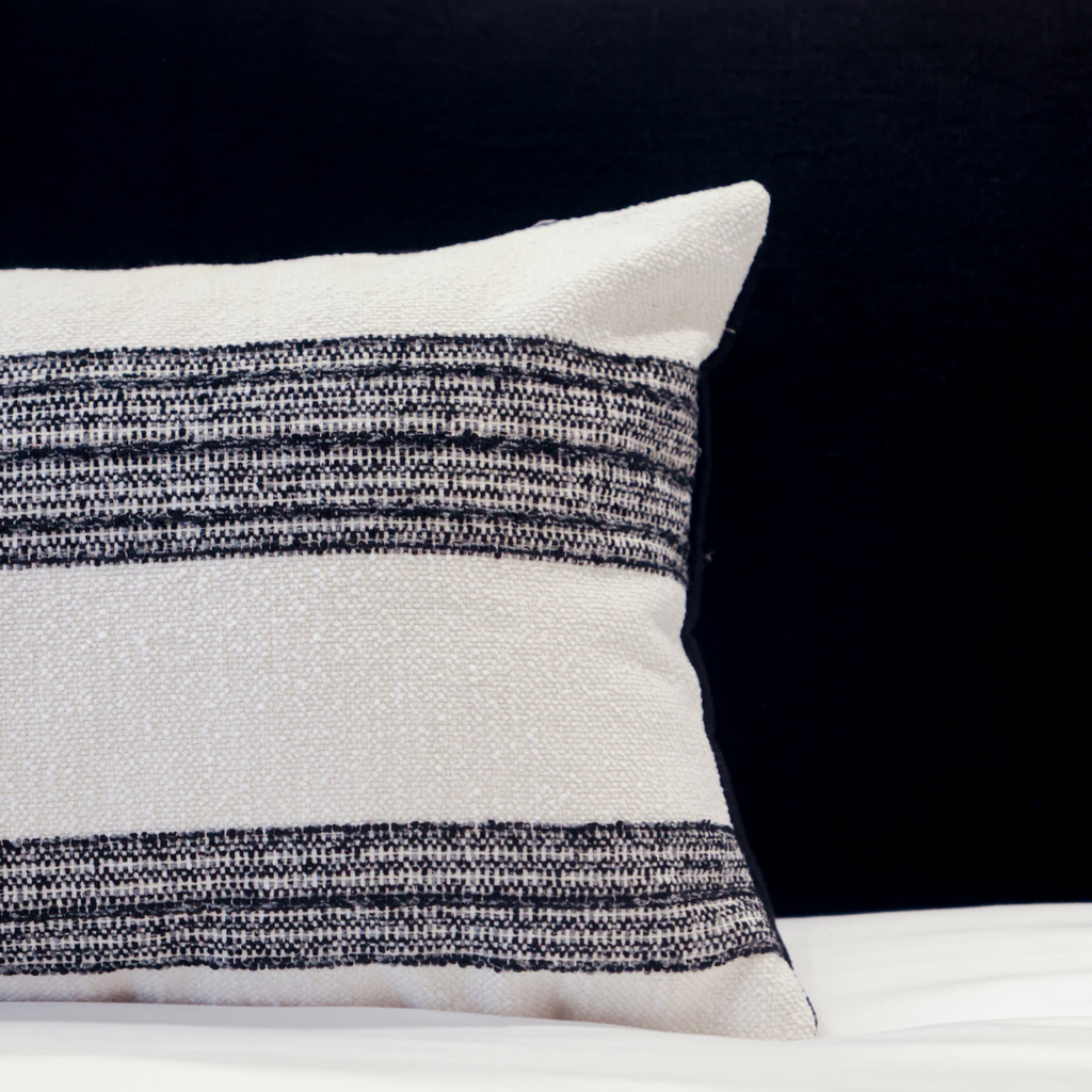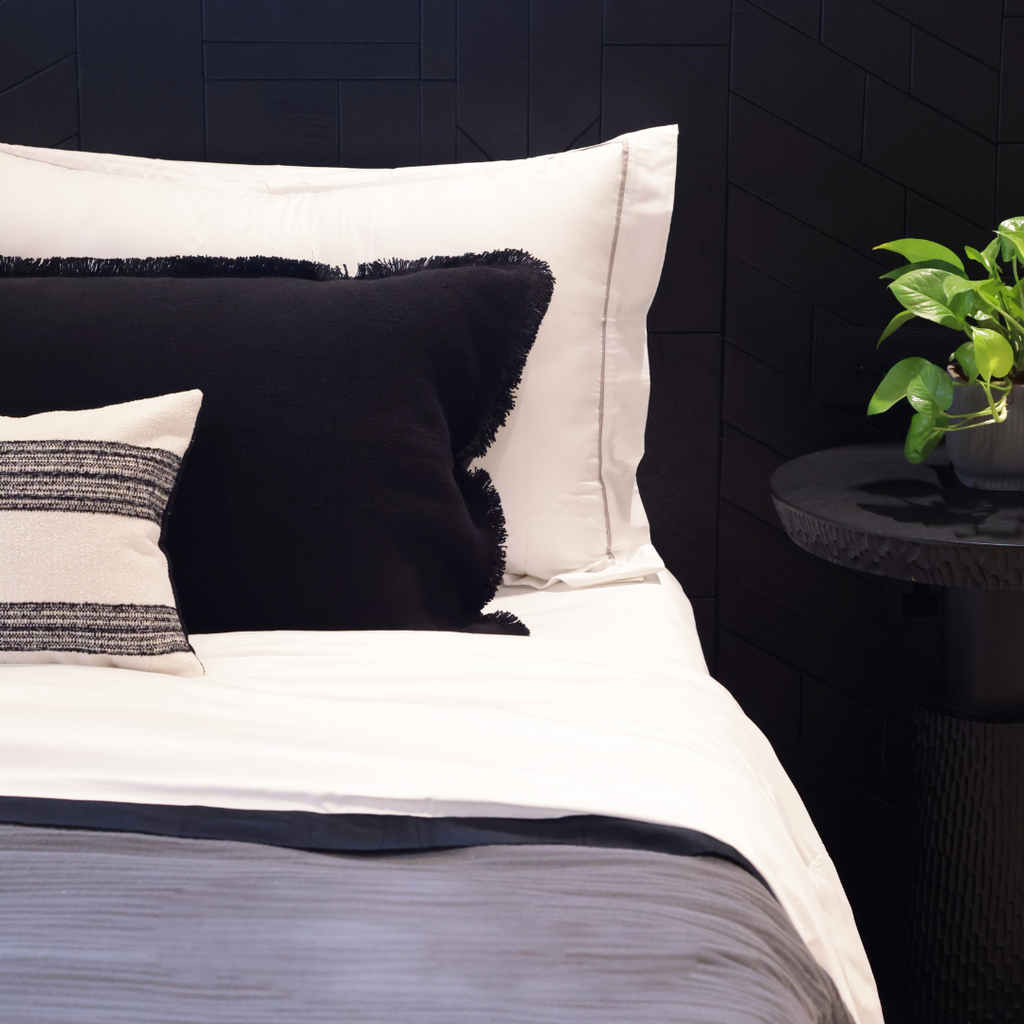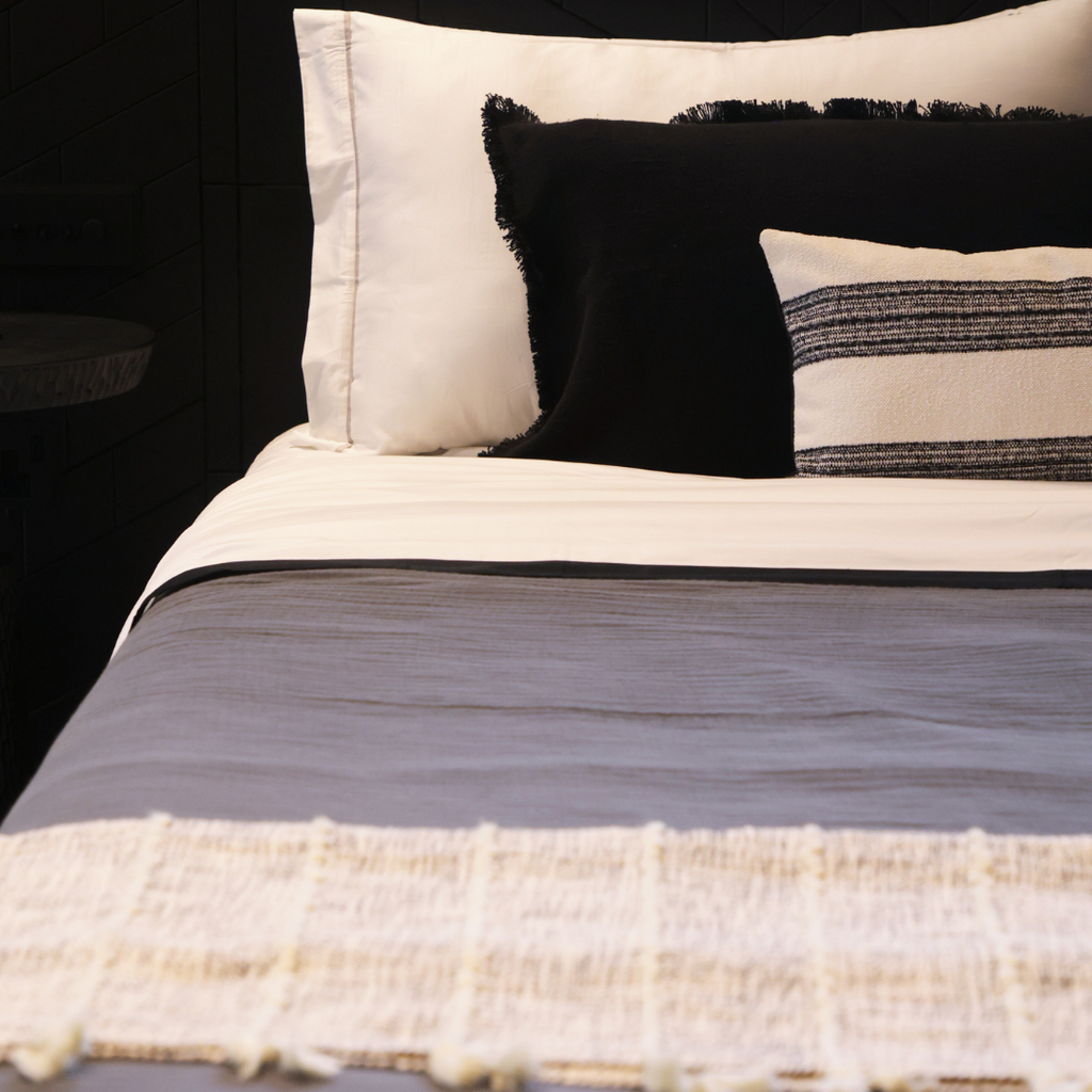 Deeply dramatic and undeniably sophisticated, the Noir Abyss look is a study in contrasts and textures. The bed is dressed in our Pipping Grey Bedsheet set, including a duvet cover, bottom sheet, and two shams, offering a subtle, refined base. Our Muslin Charcoal Bedcover adds rich, tactile depth and a striking contrast. Two plush charcoal cushions provide luxurious comfort. The lumbar, seen in a close-up, features a textured, white-colored fabric with bold, woven stripes in charcoal and black, adding a graphic element and tactile interest. The charcoal cushion behind it reveals a subtle, textured weave, enhancing the depth of the palette. A textured throw completes the look, adding warmth and sophisticated style.