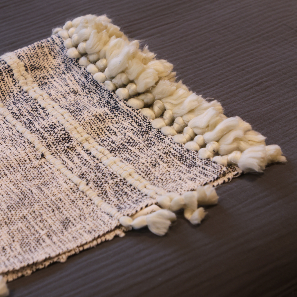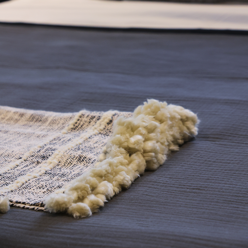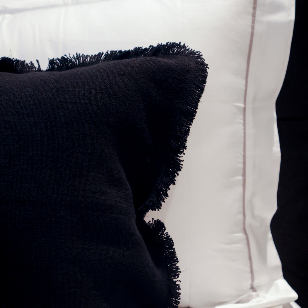 Deeply dramatic and undeniably sophisticated, the Noir Abyss look is a study in contrasts and textures. The bed is dressed in our Pipping Grey Bedsheet set, including a duvet cover, bottom sheet, and two shams, offering a subtle, refined base. Our Muslin Charcoal Bedcover adds rich, tactile depth and a striking contrast. Two plush charcoal cushions provide luxurious comfort. The lumbar, seen in a close-up, features a textured, white-colored fabric with bold, woven stripes in charcoal and black, adding a graphic element and tactile interest. The charcoal cushion behind it reveals a subtle, textured weave, enhancing the depth of the palette. A textured throw completes the look, adding warmth and sophisticated style.